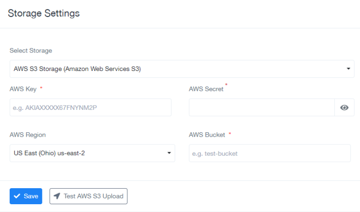 Set up AWS Key, Secret, Region, and Bucket details for reliable storage management.